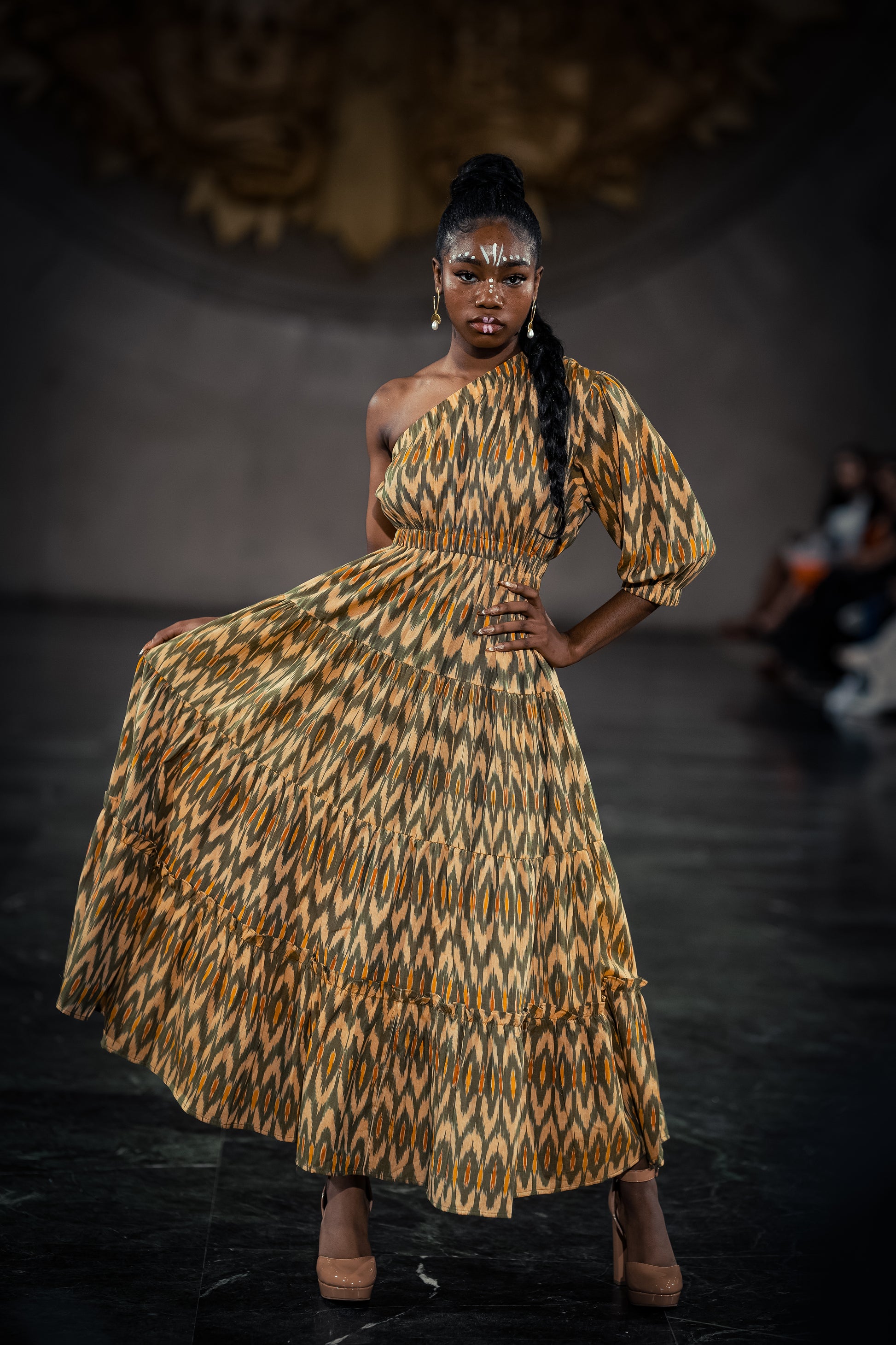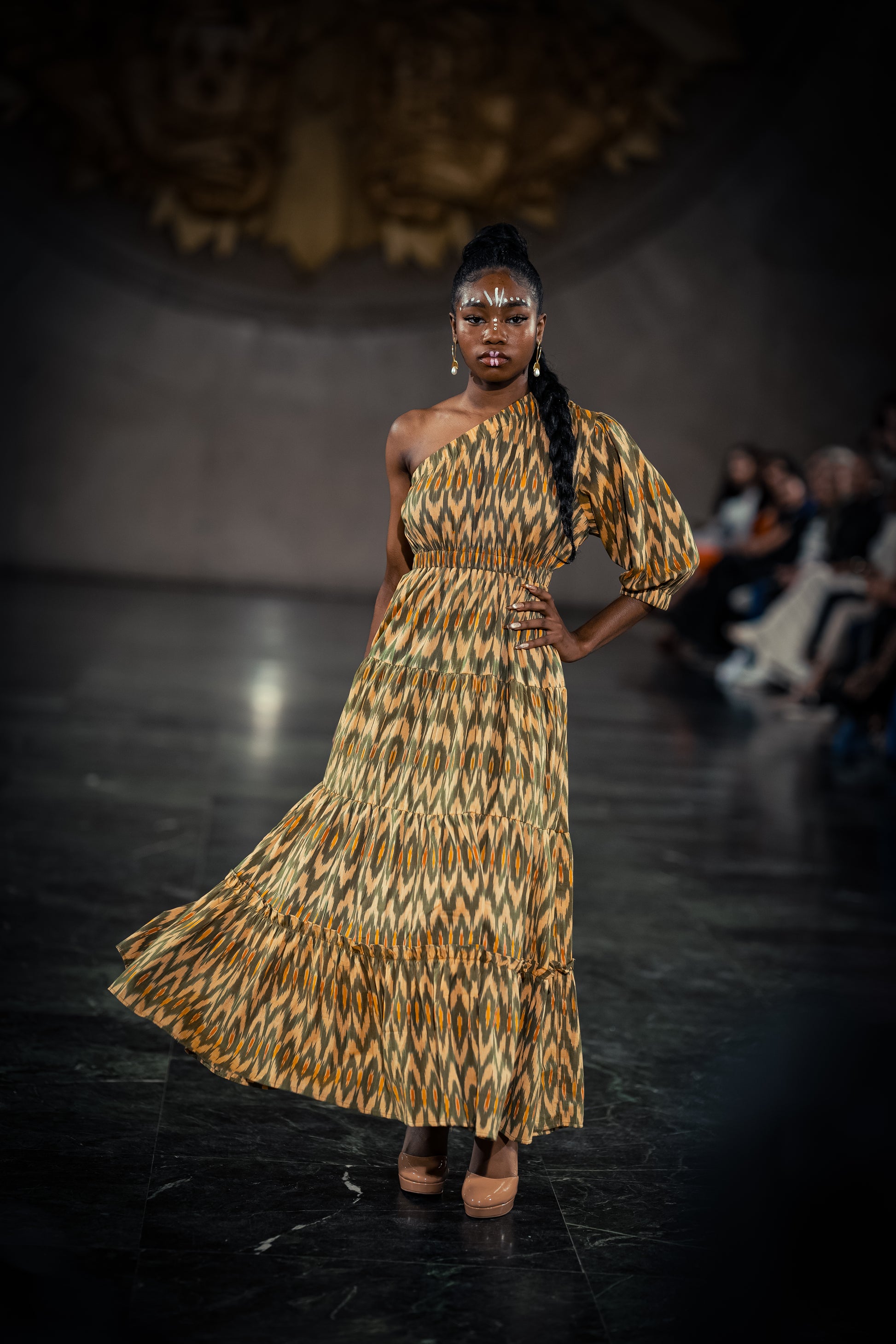 Design: One shoulder maxi dress in maze like pattern for a trendy look.